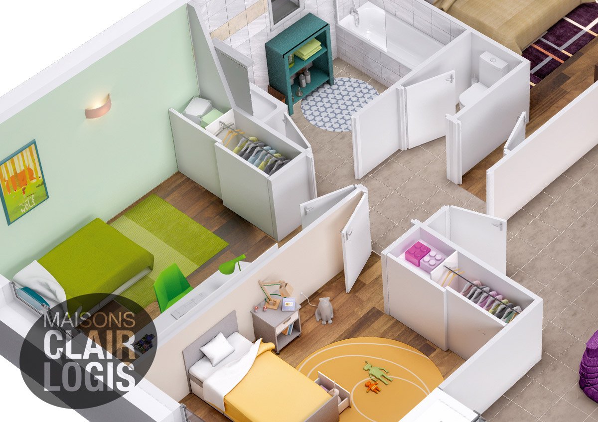 Optimisé pour vous offrir un maximum de surface habitable, le plan intérieur de ce modèle est agencé en deux espaces avec un vaste salon/séjour/cuisine très lumineux d'un côté, et une partie nuit de trois chambres de l'autre côté.