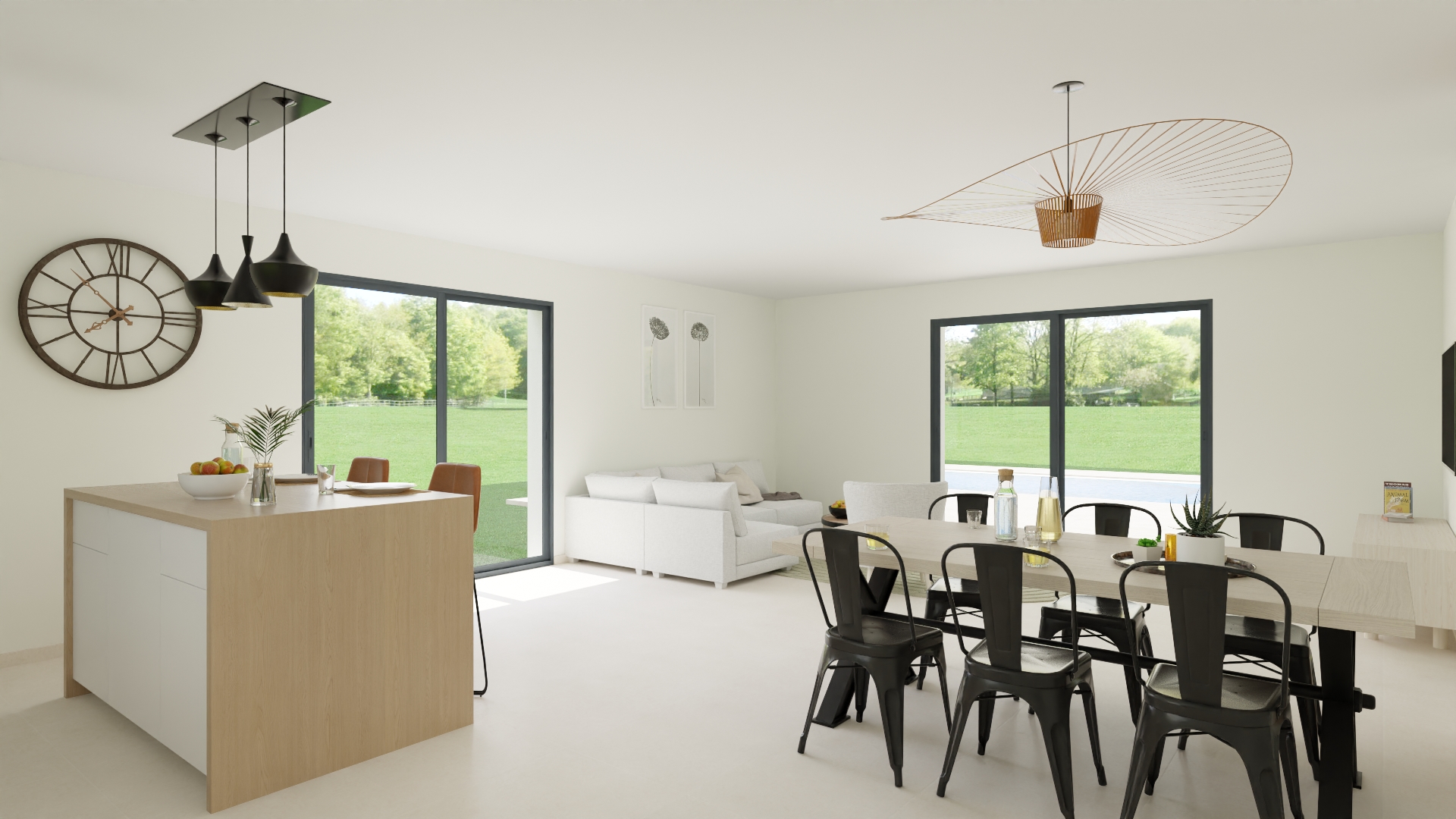 Une grande cuisine ouverte avec îlot central donnant sur le salon/séjour et un cellier attenant complètent la partie jour.