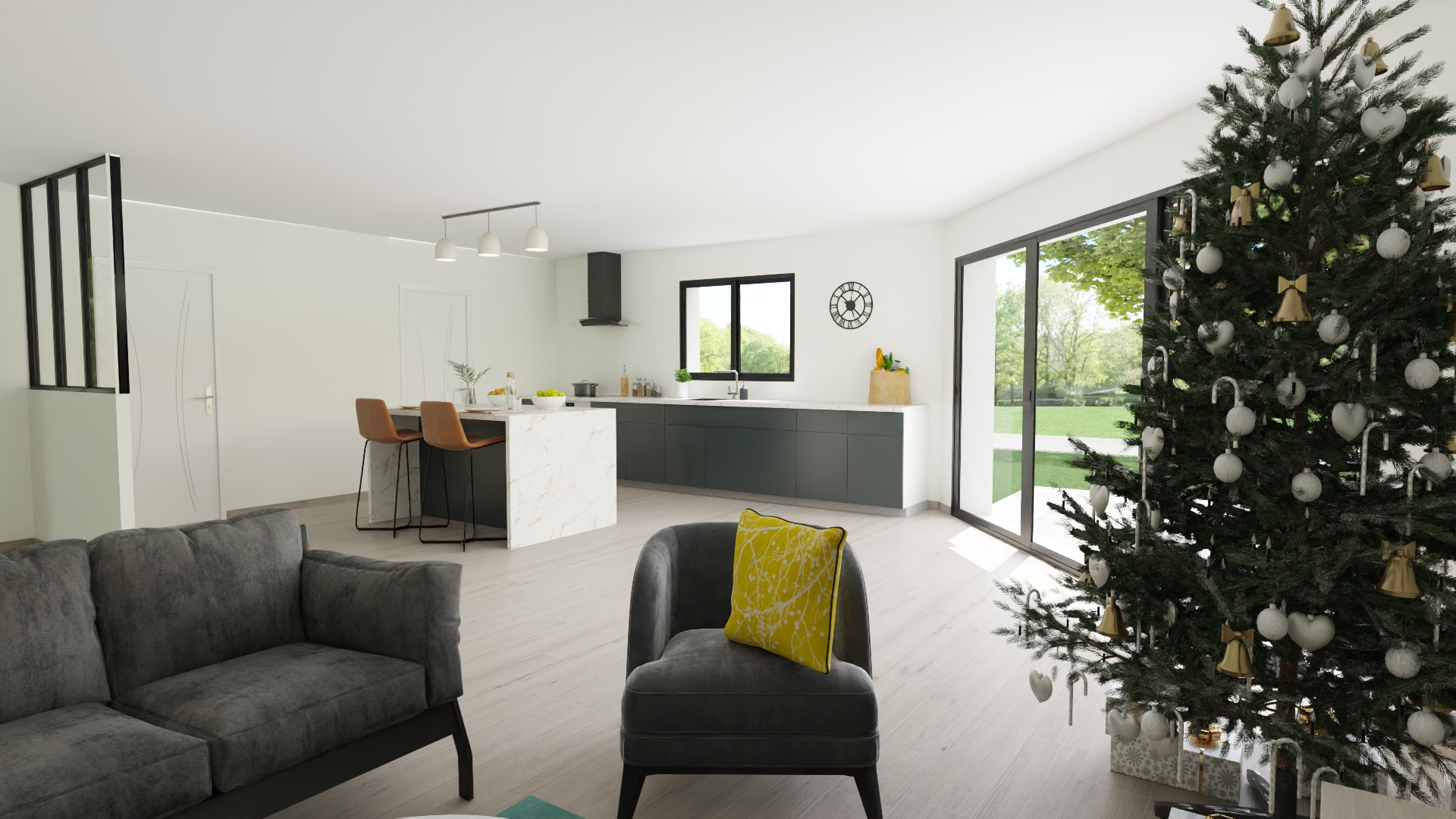Fonctionnelle, cette maison traditionnelle dispose d'une belle pièce de vie à triple orientation, avec une grande baie vitrée pour un maximum de lumière.