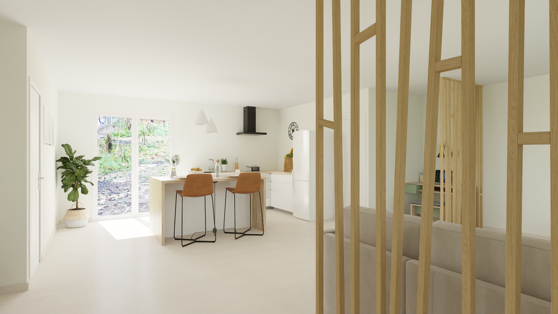 Grâce à de nombreuses portes-fenêtres, votre grand salon/séjour/cuisine est très lumineux.