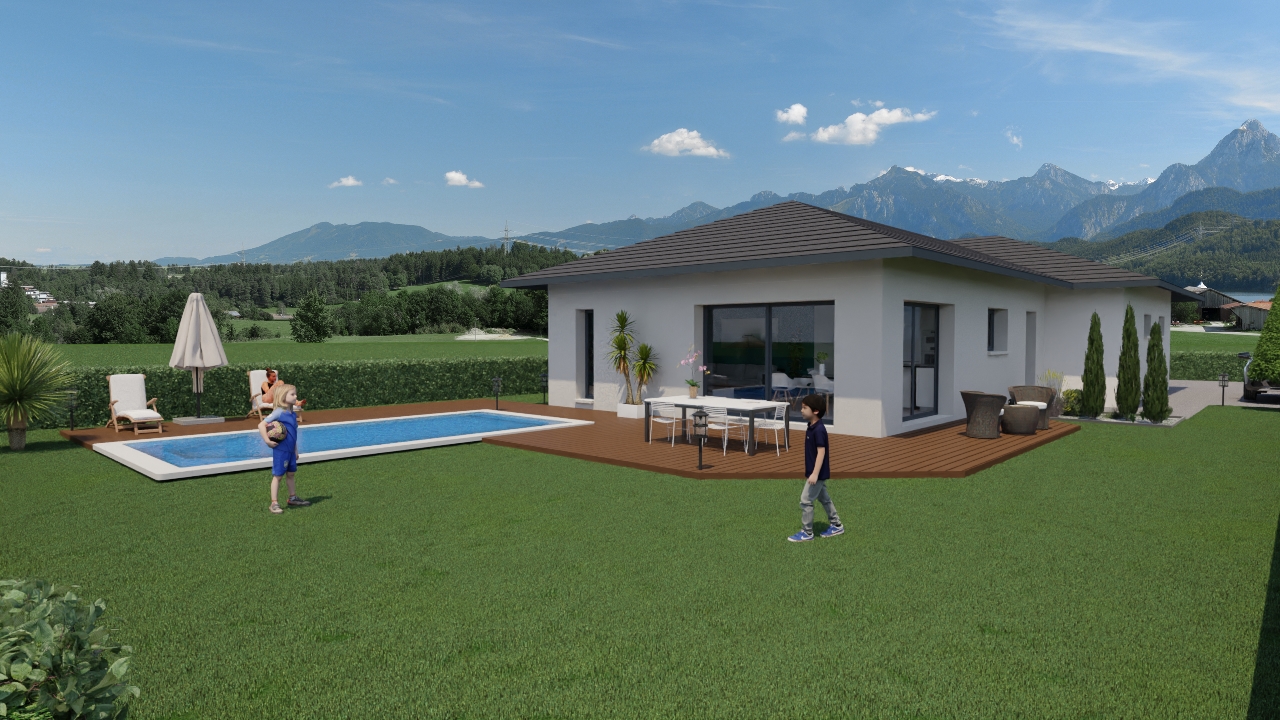 Laissez-vous séduire par cette belle maison en L de plain-pied, avec garage intégré. Sa forme favorise un agencement en deux espaces distincts avec une partie jour et une partie nuit de quatre chambres indépendantes.