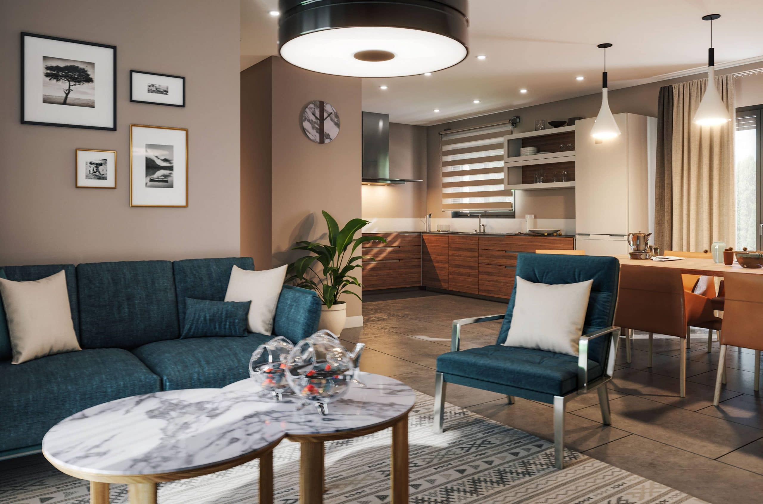 Un vaste séjour baigné de lumière naturelle, ouvert sur une cuisine spacieuse. L'espace est modulable pour créer une salle à manger et un salon distincts selon vos envies.