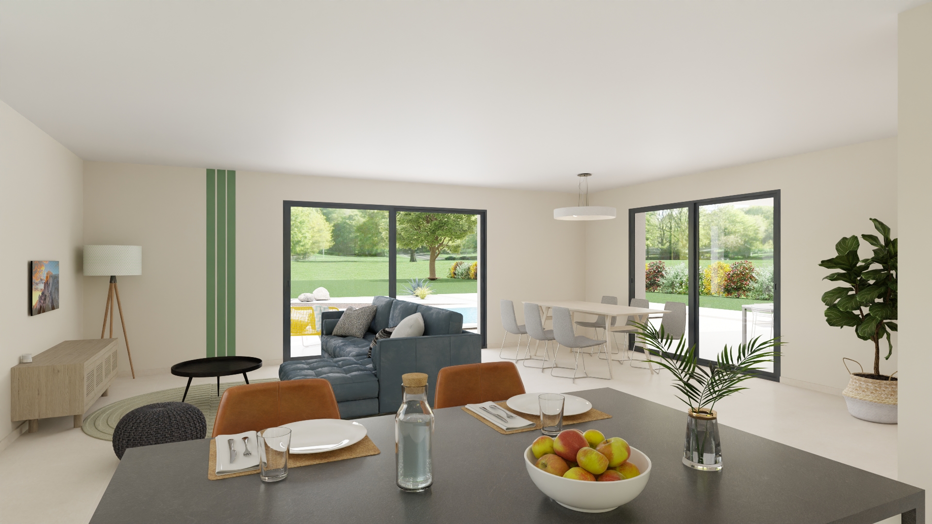 Fonctionnelle, cette maison traditionnelle dispose d'une belle pièce de vie à triple orientation, avec une grande baie vitrée pour un maximum de lumière.